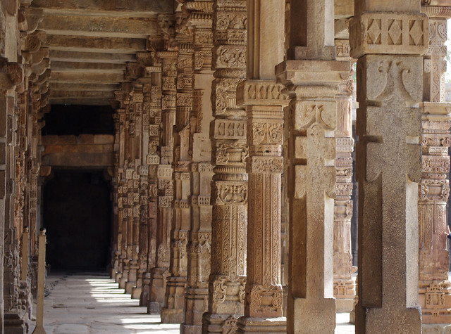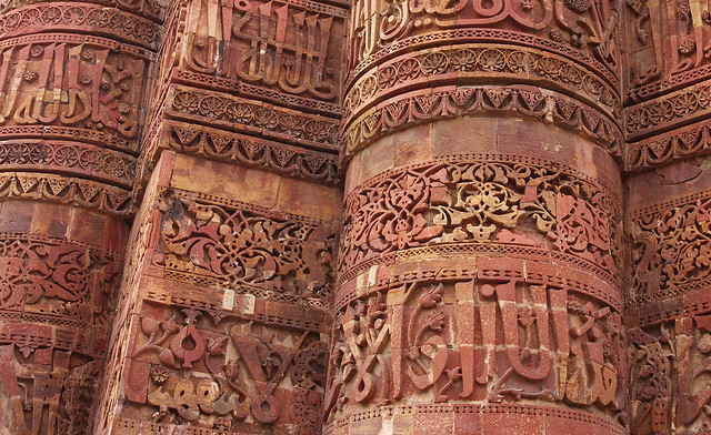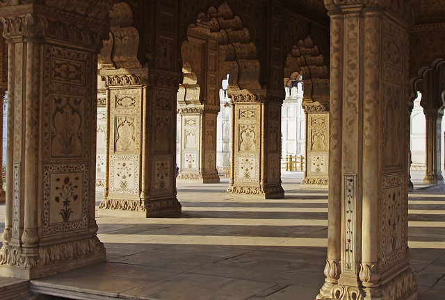 intricately-decorated columns in the red fort