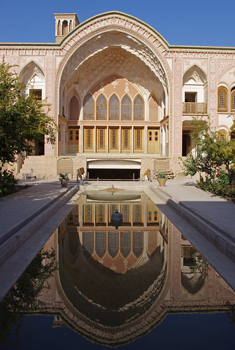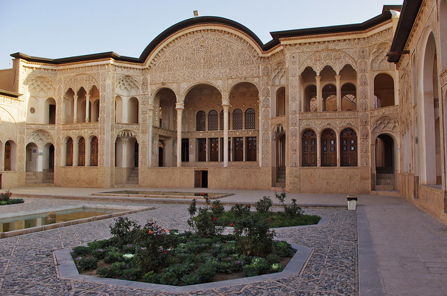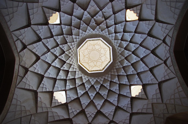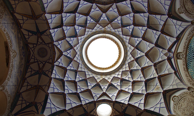 The other three houses – Boroujerdi, Tabbatabaie and Abbasian appeared smaller compared to the first one but were nonetheless as impressive. I was particularly fascinated by the detailed symmetry in the ceilings of these houses. I had first witnessed this symmetry in the Yazd Bazaar, but the ones in Kashan were definitely much more complex and I could only imagine the kind of mathematical calculations that were necessary in order to build these. All of these houses had a square or rectangular-shaped courtyard with a garden, in keeping with the style of traditional Persian architecture that I had already seen in Yazd and other places in Iran. Some had fine stained glass windows and intricate carvings on the outer walls. No wonder the renovation is taking a lot of time to finish!