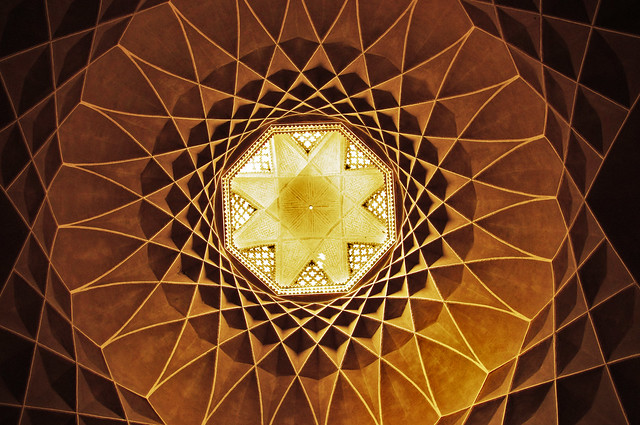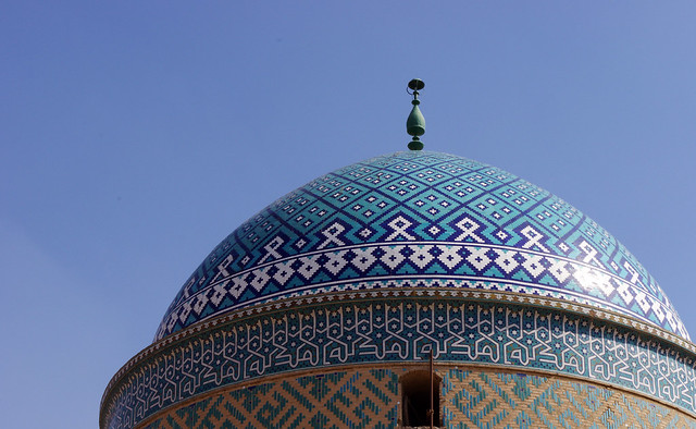 Not wanting to discuss these things with me, I decided to leave the guy and make a move. I then proceeded to Dolatabad Gardens. Although I had been to 3 gardens in Shiraz, I decided to check this one out due to the UNESCO World Heritage designation. Going in, I found the grounds to be less impressive than those I saw in Shiraz. The summer pavilion however, is quite unique. It has a very tall wind tower used for ventilation that can be seen from most parts of the city. Octagonal-shaped, the pavilion is flanked by stained-glass windows and a symmetrical pattern on its ceiling. This was my introduction to the many other impressive, symmetrical ceilings/domes that I would witness later on in the trip.