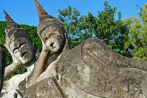 We finally arrived at the gaudy-looking Buddha Park. Honestly, I thought it would be much larger. But in reality, it’s more like a garden/park filled with Buddha statues of various shapes and sizes.Β There were many bizarre representations of the Buddha, but I found the reclining Buddha to be quite imposing.