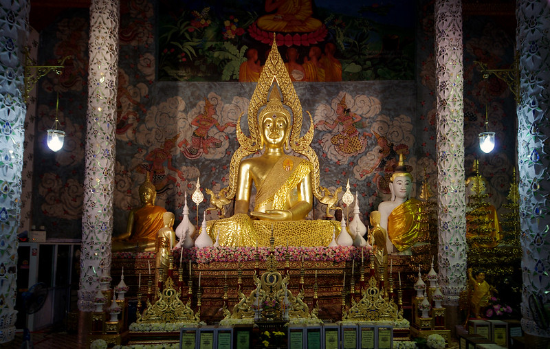 The former’s the most famous among Phrae’s temples, and it clearly showed during my visit as it was the only one filled with people. The main stupa was being renovated when I visited but I thought the grand staircase that led to the temple on a hill was quite imposing and made the 3 kilometer trip to see this temple worth it. The Buddha image inside the prayer hall was also quite impressive, as it’s set against a wall of murals.