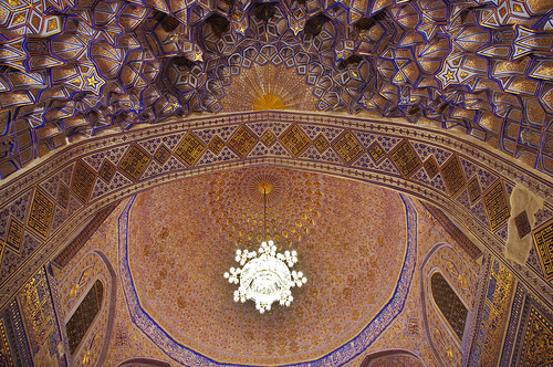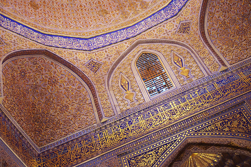 The first place we went to was the Gur-e-Amir Mausoleum. Built in the 1400’s, it is the resting place of Tamerlane and some of his sons. From the outside, it actually looks quite similar to the other historic buildings we’ve seen in the previous two cities. From the inside, it is a different story. The mausoleum appears as a large chamber filled with several detailed beehive patterns in the four corners of the walls. The arches and the internal dome are filled with high-relief gilded papier-mache.