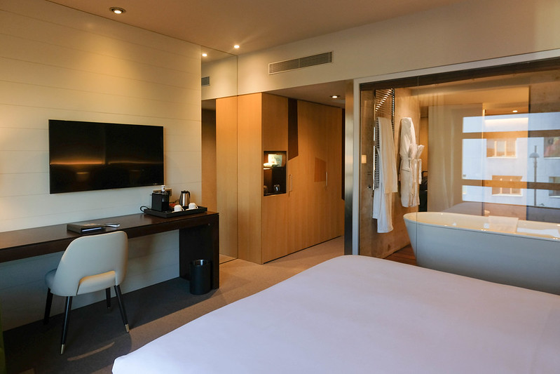 The tub is a standalone type and if one wishes to, guests can raise the blinds to reveal a panoramic view of the room, and in turn of the happenings by the museum, while enjoying a hot bath. This in turn, also increases the perception of size when it comes to the (already) spacious room.