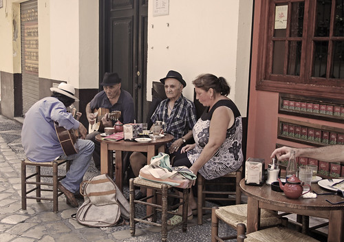 a group of old men (and a lady!) jamming in a random roadside cafe… and they’re great at it too
