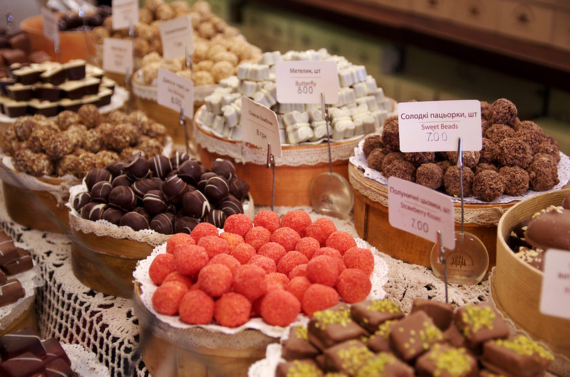 The establishment is spread over several floors, with a café at the ground level serving hearty cups of hot chocolate and a shop at the upper floor with every imaginable type of chocolate available! Best of all, prices are reasonable and most types can be had for around UAH 8 (~ $0.30) per piece. You can practically have a small bag of chocolates for a dollar or two.
