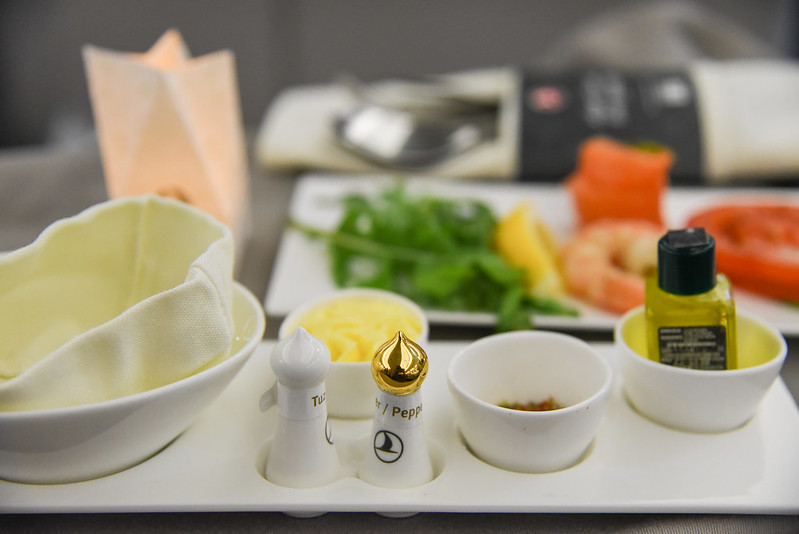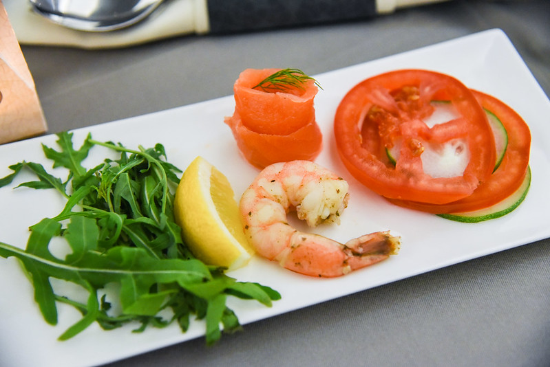 Around 30 minutes after takeoff, meal service started. I was first presented with the appetizer – a nice plate of Grilled Prawn and Smoked Salmon with Horseradish.