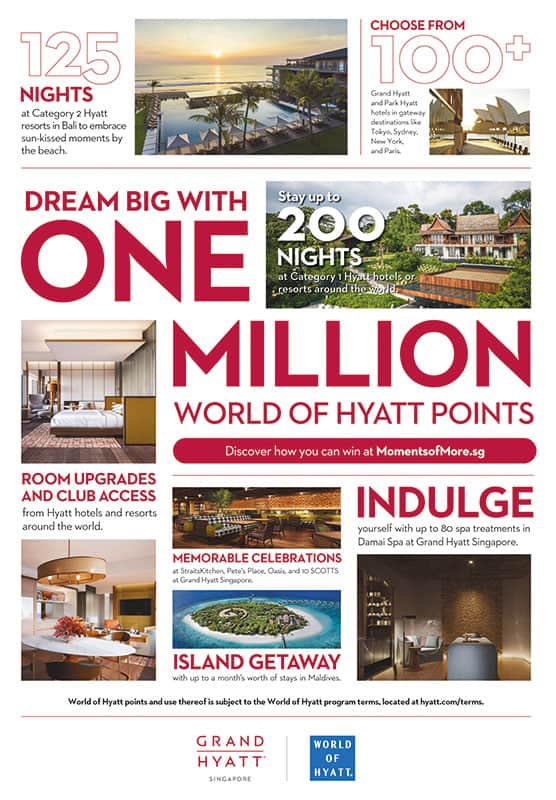 There will be 5 prizes awarded in all for the contest. One Grand Prize winner will be rewarded with 1 million World of Hyatt points and the other four will each win a 2-night stay in the refurbished Grand Hyatt Singapore with S$600 hotel credits.