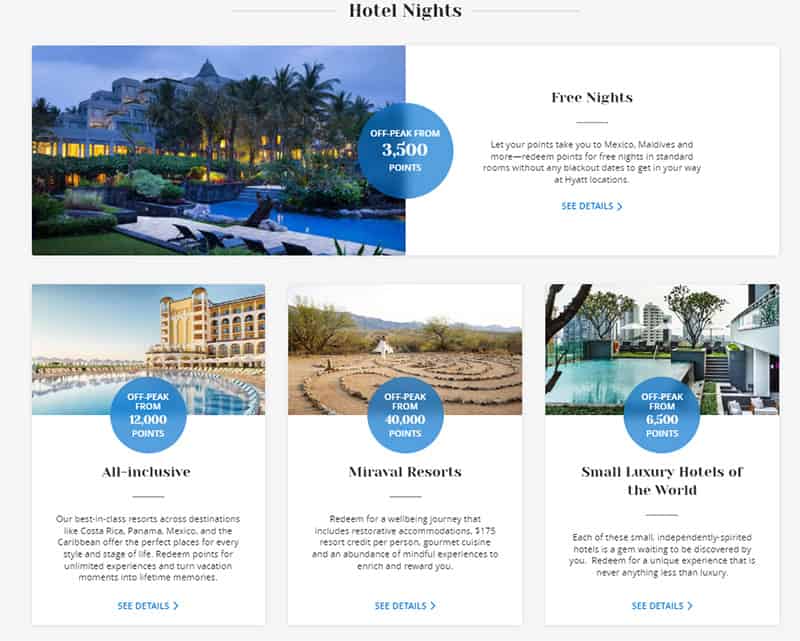 World of Hyatt points can be redeemed for room stays at Hyatt properties around the world. The number of points required to redeem a free night depends on the hotel category as well as the seasonality of the date of stay. Hyatt has off-peak, standard and peak categories for dates while their properties are divided into 8 tiers depending on the price range.