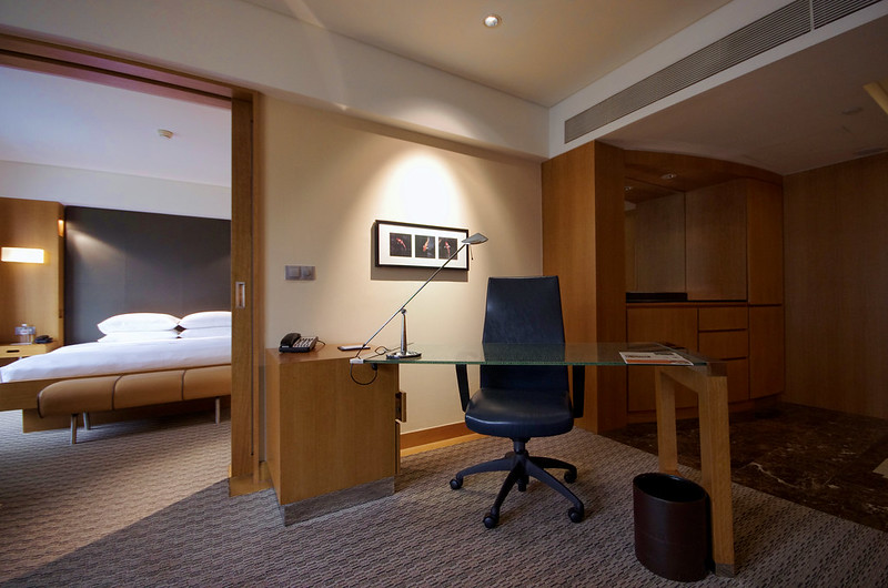 Housed in an enclosure of its own is the bedroom which came with another TV (slightly smaller, at 32″). I particularly noted the symmetrical layout of the bed here as well as the lighting fixtures which to me came uncannily similar to scenes from the film “Lost in Translation” which by the way was filmed in another Hyatt property (the Park Hyatt Tokyo).