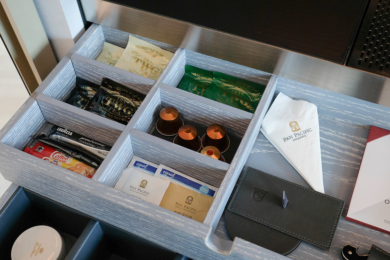 The hotel does not provide bottled water in the room. Instead, a water dispenser is situated in the minibar area. There’s also a Nespresso machine with 4 capsules provided, including decaf options. Tea comes from TWG.