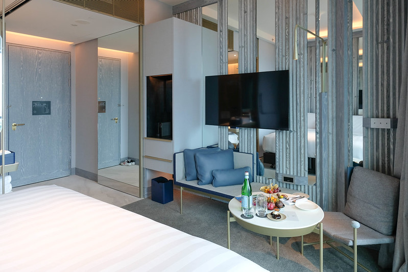 Due to the room’s squarish layout and spacious gap between the foot of the bed and TV, the sitting area consisting of a couch and lounge chair is situated directly in front of the bed rather than beside it. If you wish to watch TV and don’t want to hop on the bed, you’d need to move the rather heavy lounge chair which seats 1 to face the TV. The sofa, while moveable, is situated right underneath the TV by default and is too weighty to be casually moved by guests. In keeping with newer hotel room layouts, there is also no conventional work desk. Instead, guests can work on the multi-purpose coffee table with power sockets situated close to it.